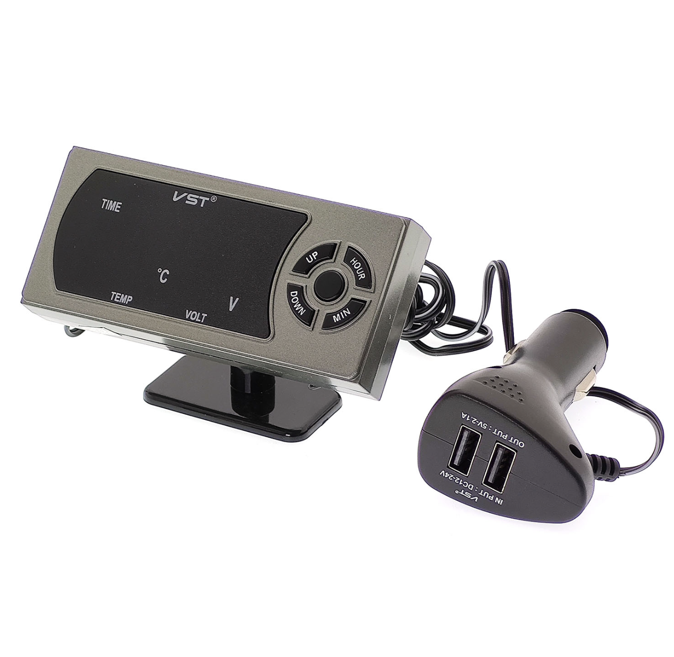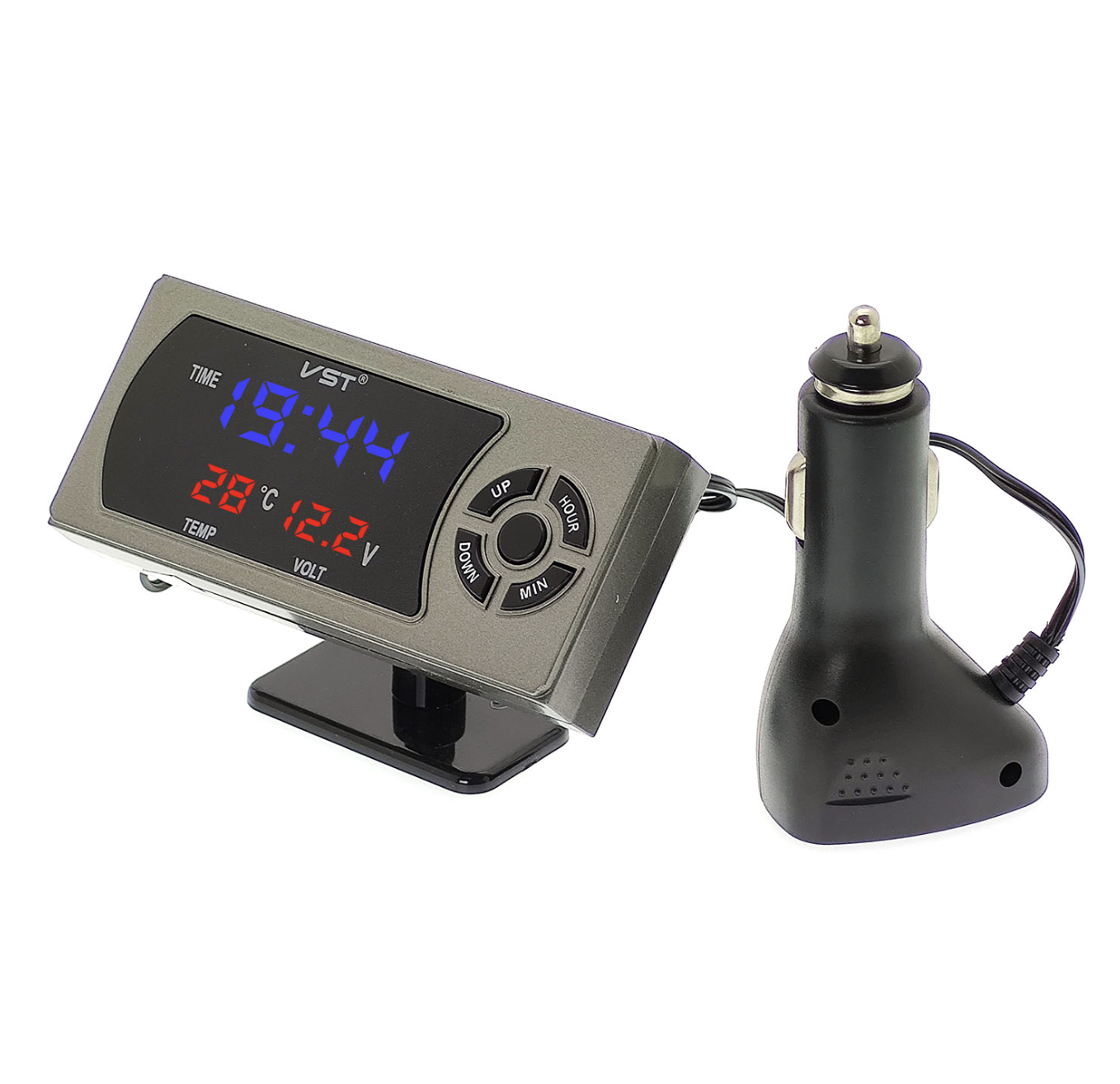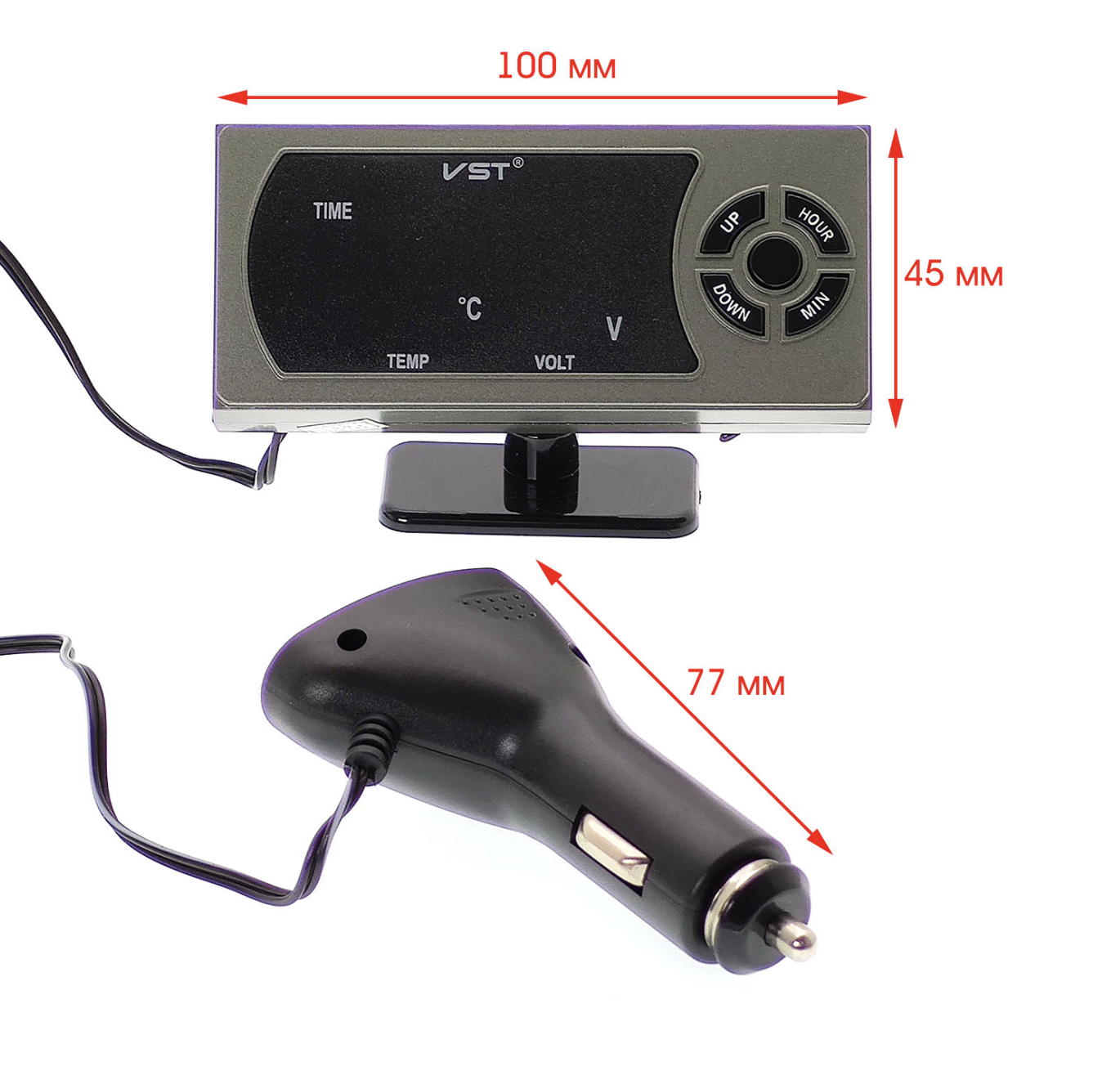 Автомобильные часы-термометр + вольтметр VST 815 станут незаменимым помощником в вашем авто. Данное устройство не только выполняет стандартные функции часов, но так же показывает напряжение бортовой сети, температуры внутри салона и снаружи. В часах есть встроенный термометр. Они показывают внутреннею и наружную температуру. Автомобильные часы-термометр VST 815 показывают температуру в градусах °C или °F. Диапазон показаний от -50 до +70 °C. Погрешность показаний термометра +/- 1.0 °C.