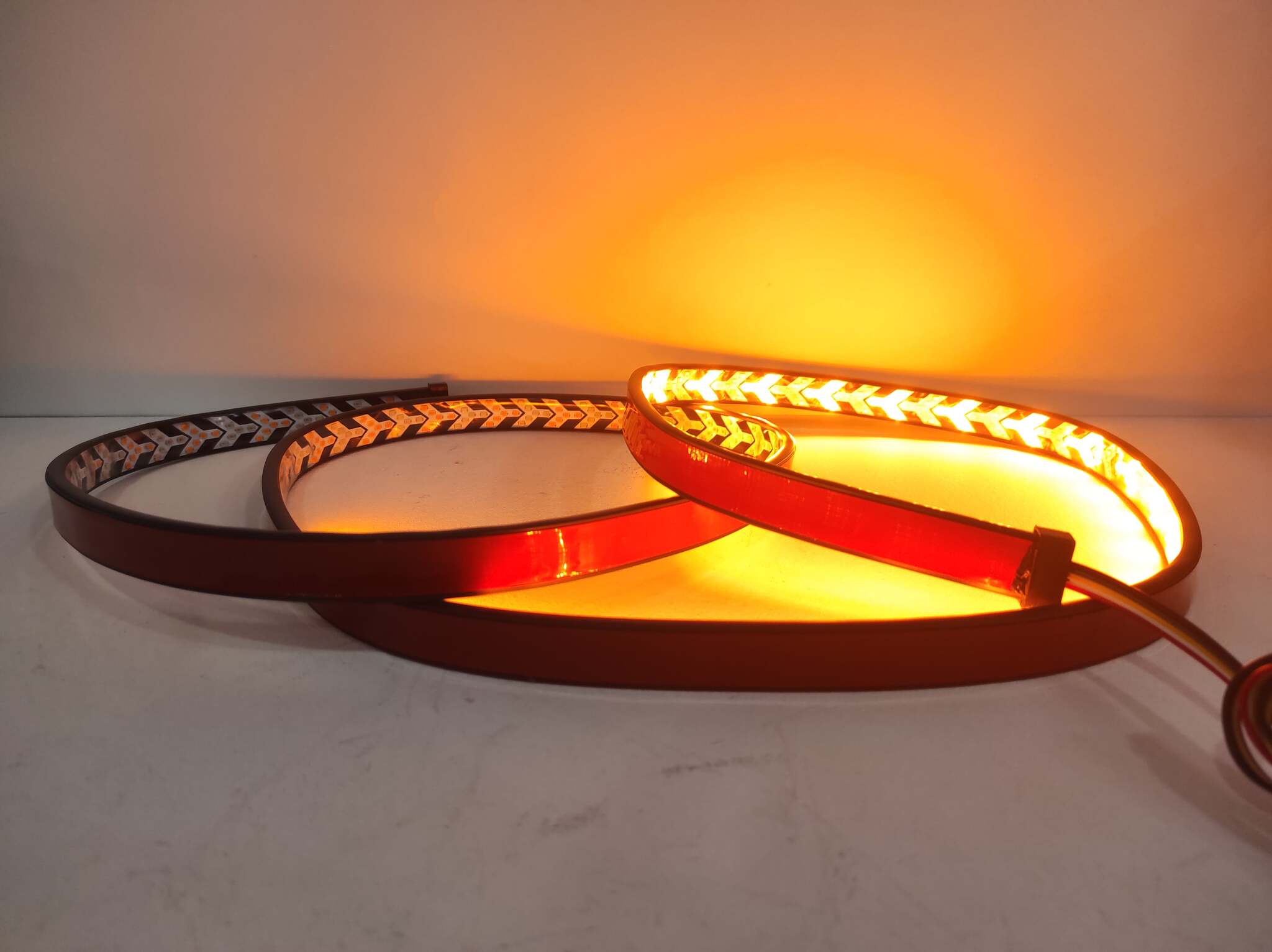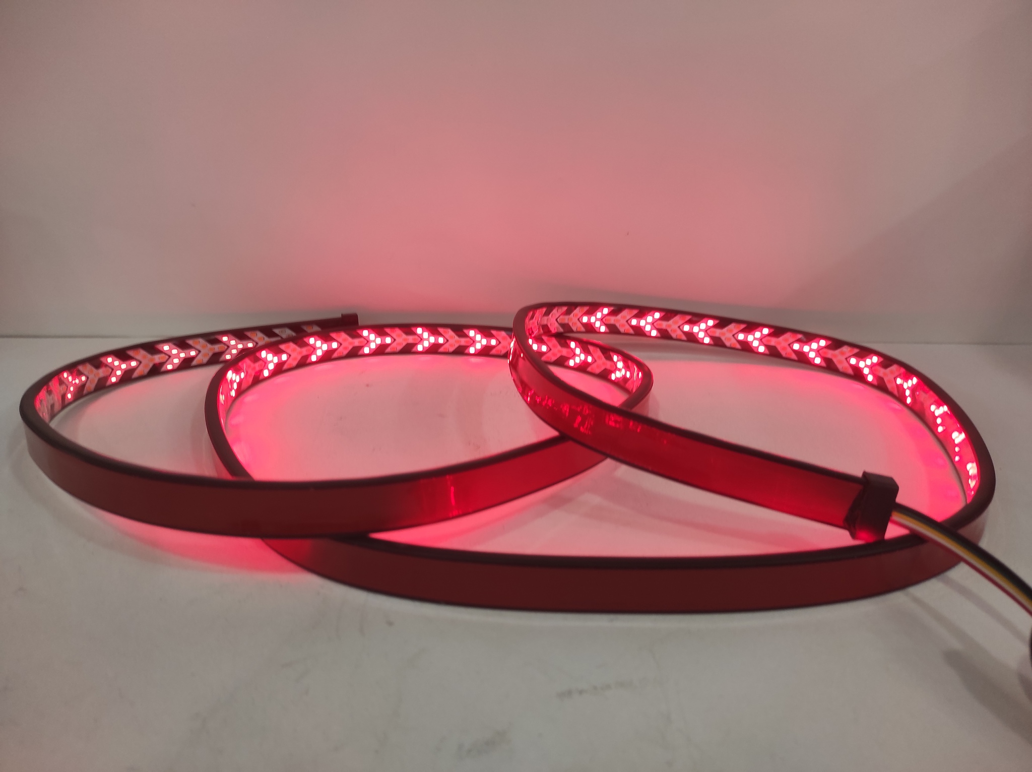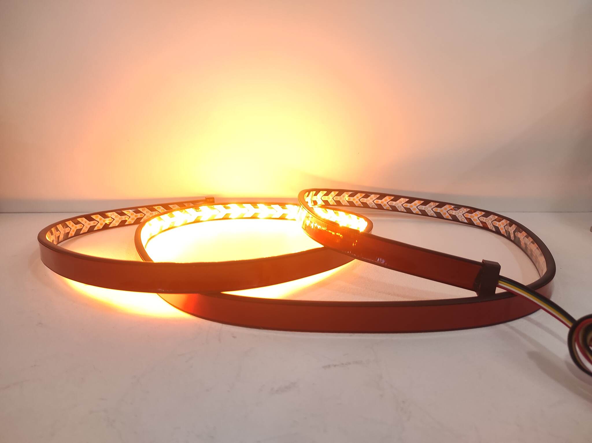 Желтый и зелёный. При включении левого поворотника, светодиоды включаются поочередно с правого конца ленты к левому, создавая эффект бегущего огня. Аналогично с правым поворотником. Таким образом, вы более наглядно проинформируете находящиеся сзади автомобили о желании совершить маневр. При подключении к "плюсу" одновременно жёлтого и зелёного проводов, диоды разгораются из центра, играя роль аварийного режима;