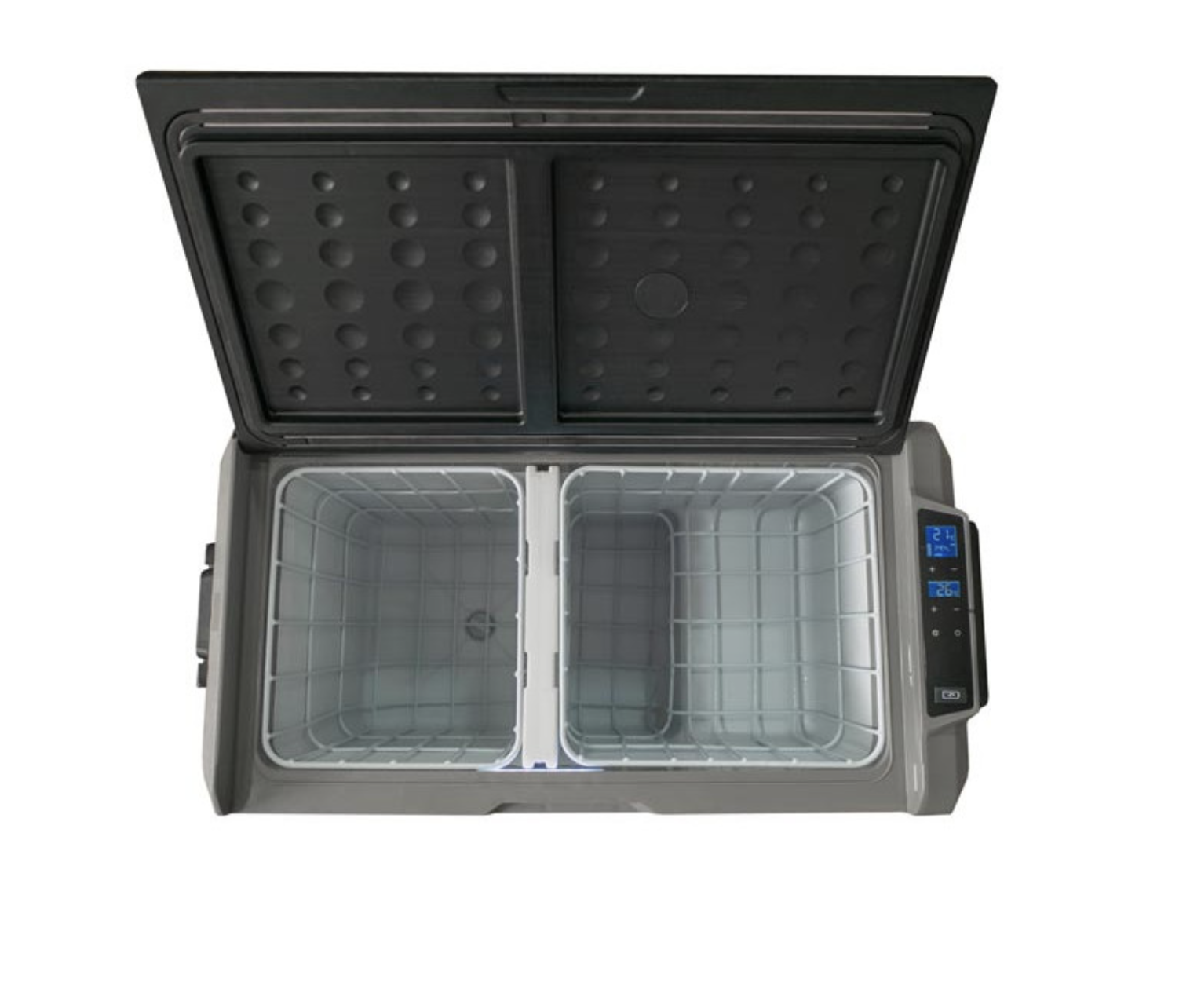 Внутреннее пространство данной модели представлено в виде просторного отсека, разделенного на две части, в каждой из которых Вы можете устанавливать необходимую температуру. Отсеки разделяет специальная перегородка, при изъятии которой, внутри холодильника образуется единый температурный режим. Вы можете с легкостью разместить достаточно большое количество продуктов и ёмкостей с напитками внутри каждого отделения. При открытии автохолодильника срабатывает датчик, за счет чего сразу же включается внутреннее освещение, равномерно распределяющее свет на оба отсека (даже при выключенном питании). Данная модель может работать в трех режимах: охлаждение, заморозка и глубокая заморозка.